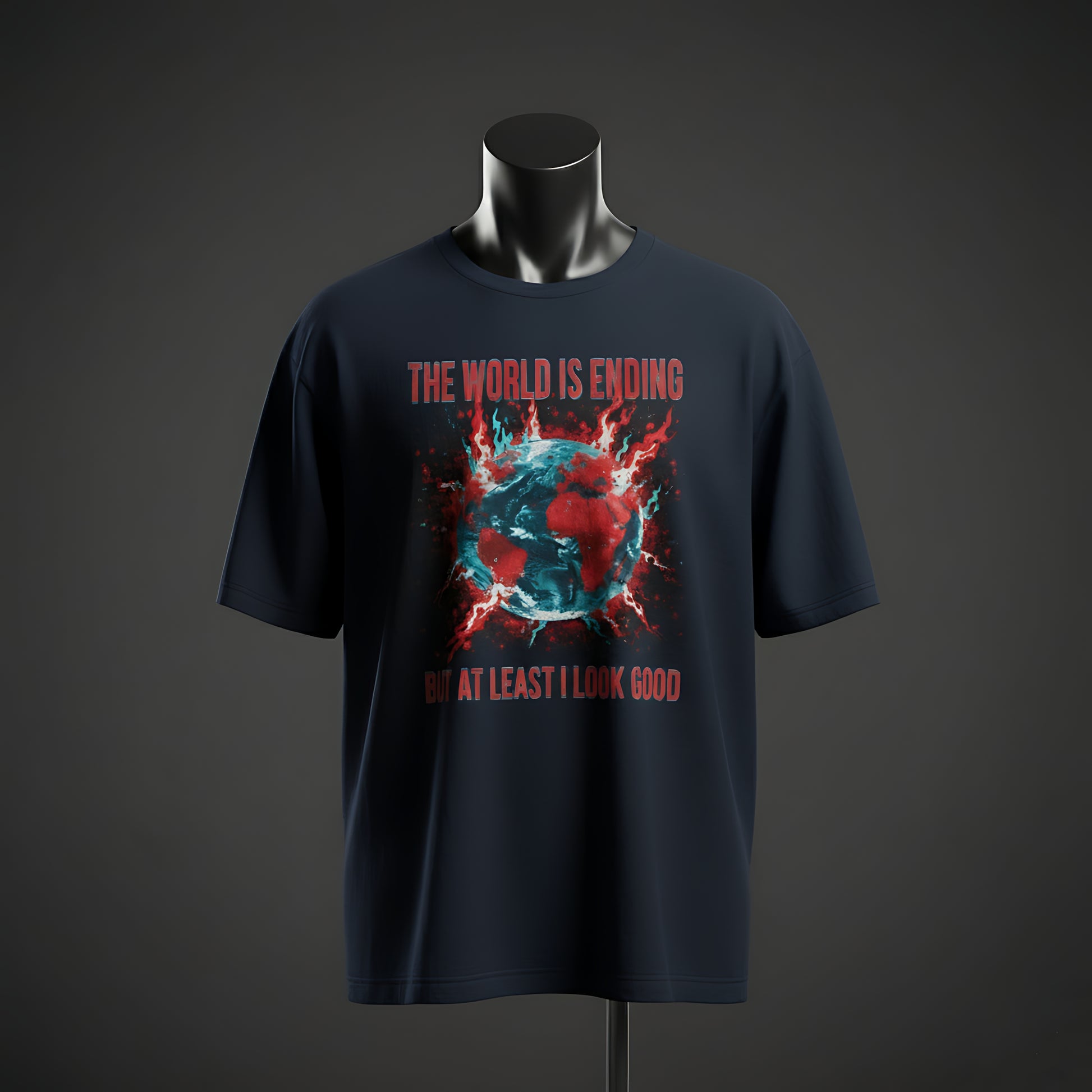 Above and below this striking visual, the defiant and darkly humorous assertion "THE WORLD IS ENDING BUT AT LEAST I LOOK GOOD" encapsulates a unique brand of confidence—a testament to maintaining one's cool, even when the metaphorical (or literal) world feels like it's falling apart. It's a statement piece for the trendsetter who appreciates irony, artistic flair, and an unflappable attitude.